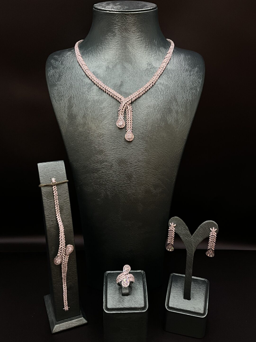 تتضمن المجموعة: قلادة، أقراط، خاتم، وسوار