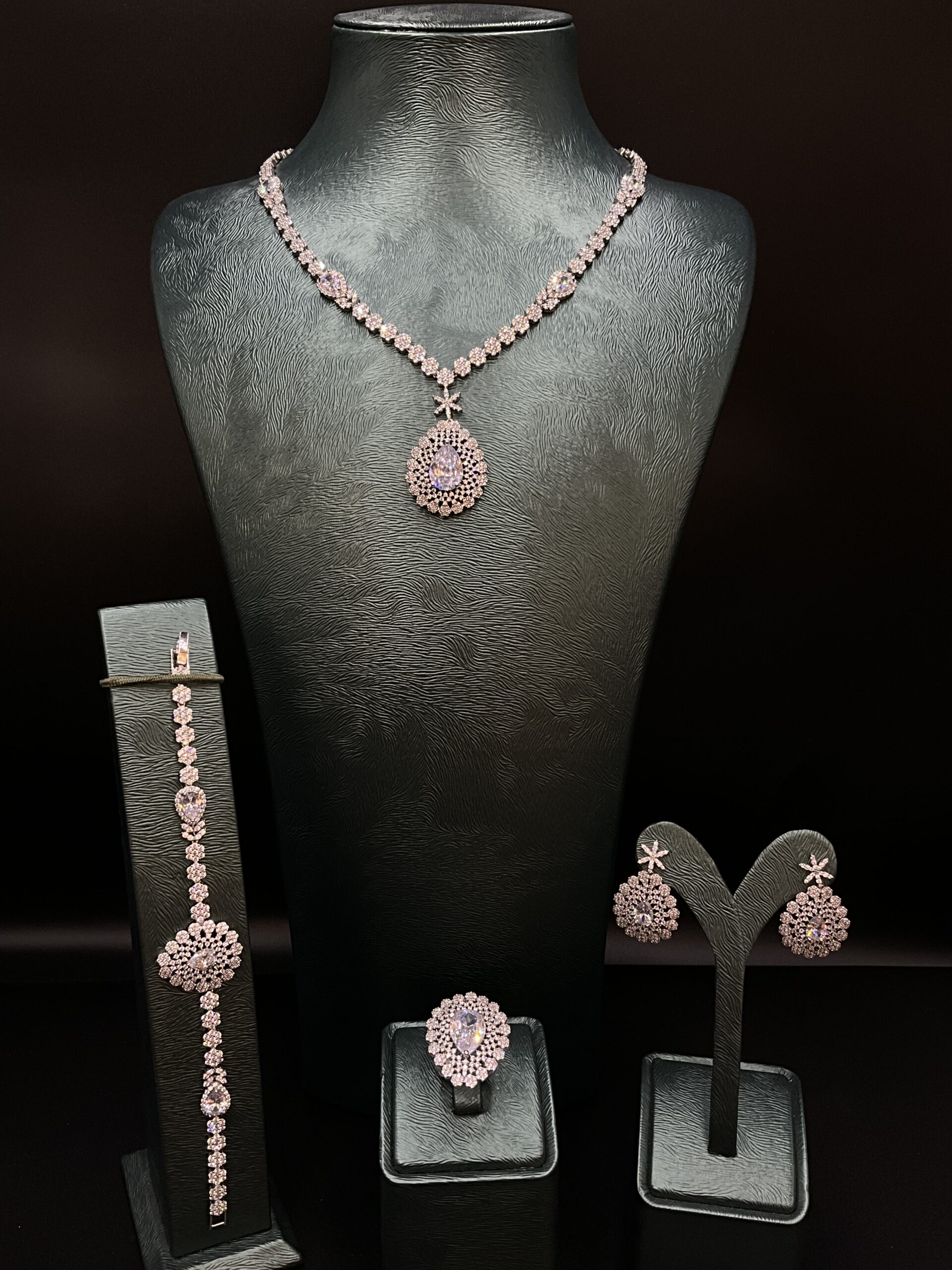 تتضمن المجموعة: قلادة، أقراط، خاتم، وسوار