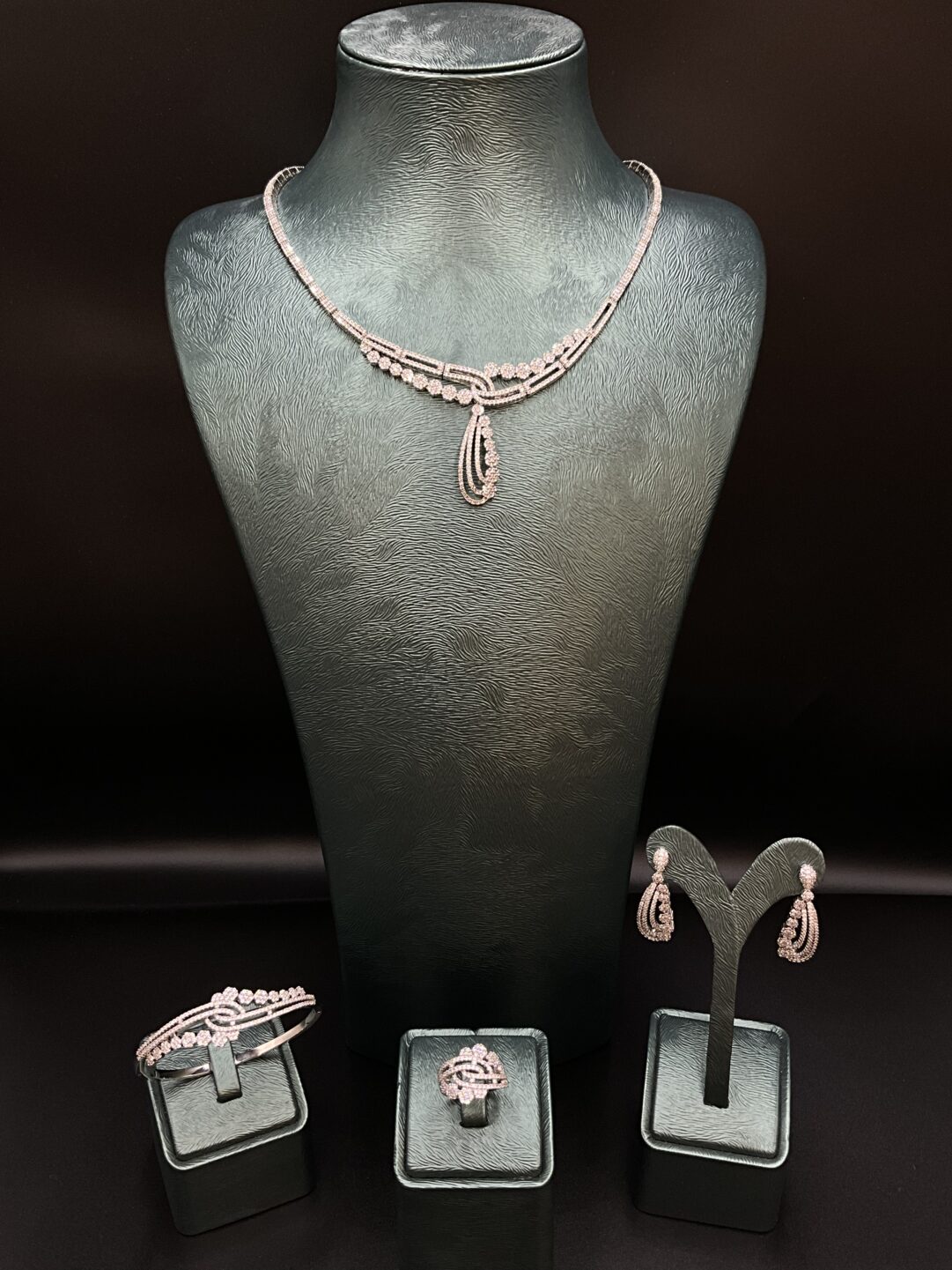 تتضمن المجموعة: قلادة، أقراط، خاتم، وسوار