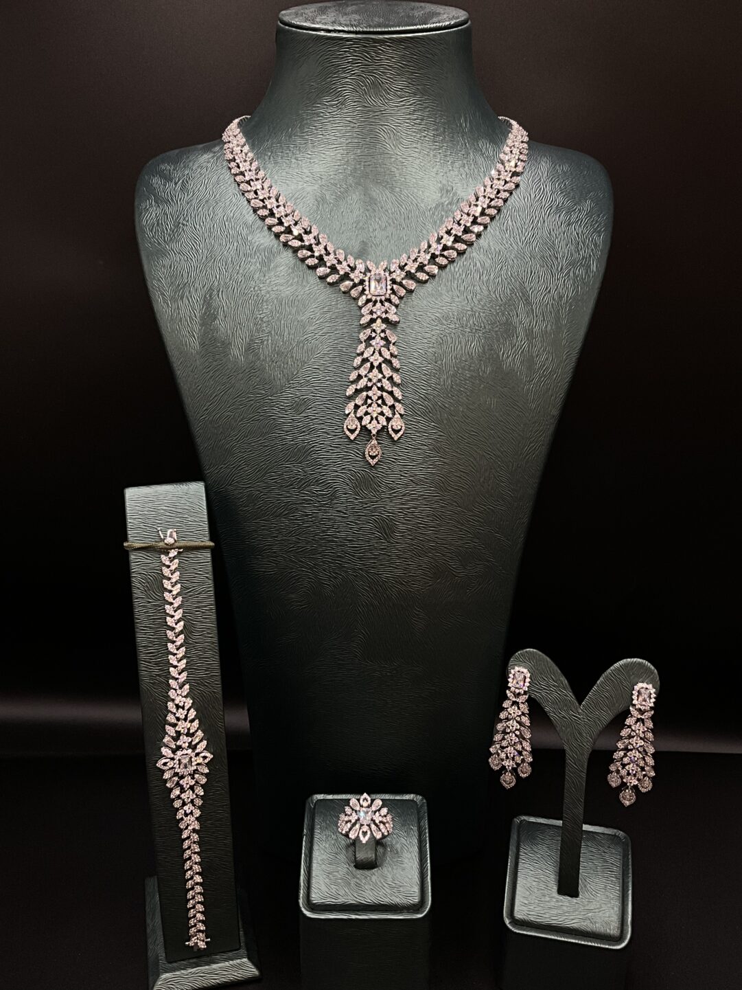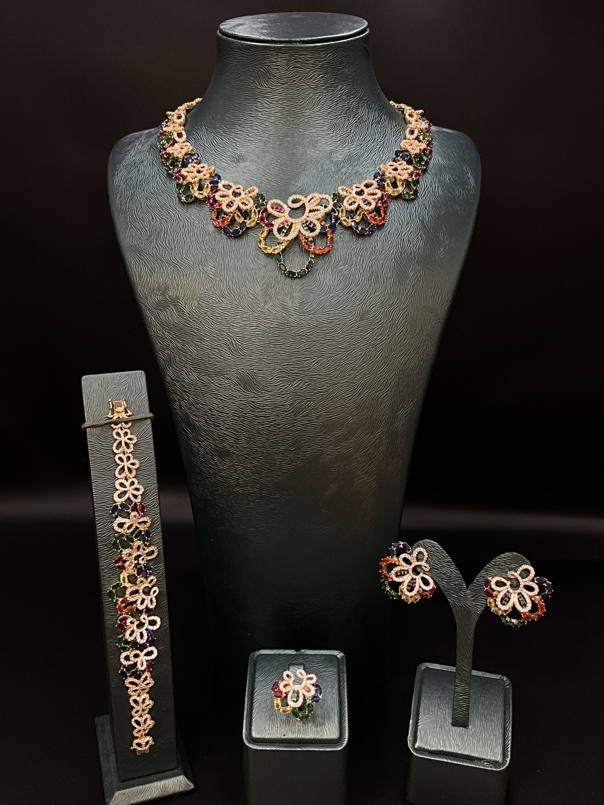 تتضمن المجموعة: قلادة، أقراط، خاتم، وسوار