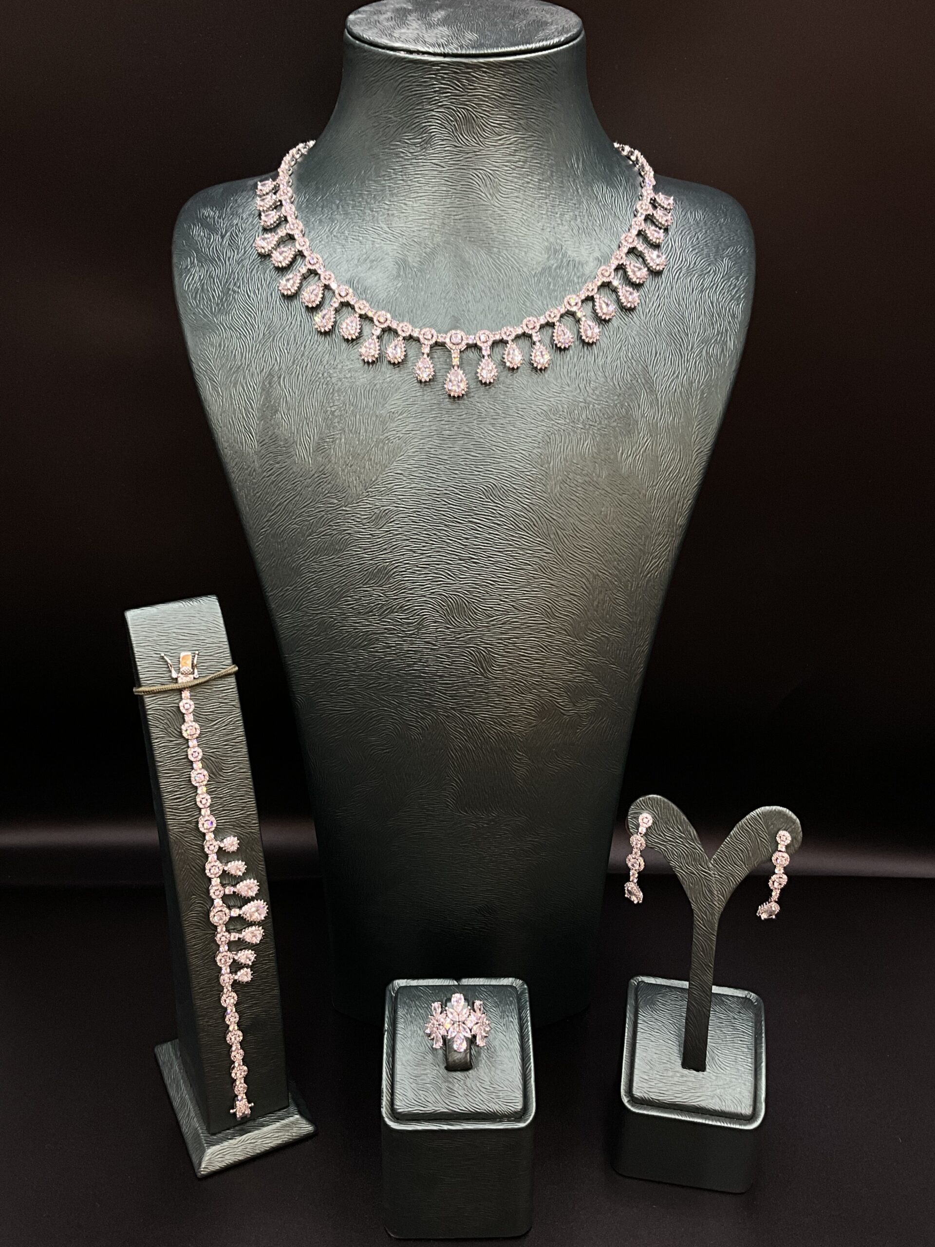 تتضمن المجموعة: قلادة، أقراط، خاتم، وسوار